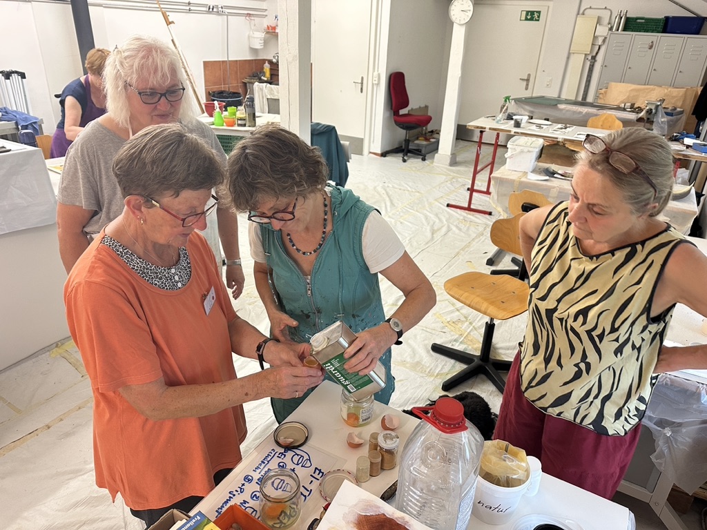 Neben den vertrauten Maltechniken, entwickeln wir selbst angerührte Farben mit Pigmenten, Erden, Pflanzen und Bindern. Wir malen mit Eitempera, Kasein- und Knochenleimfarben auf verschiedene Bildträger. Auch besteht die Möglichkeit meine künstlerische Spezialität, das Gestalten mit flüssigem Bienenwachs und verschiedenen Goldfarben, zu erlernen.